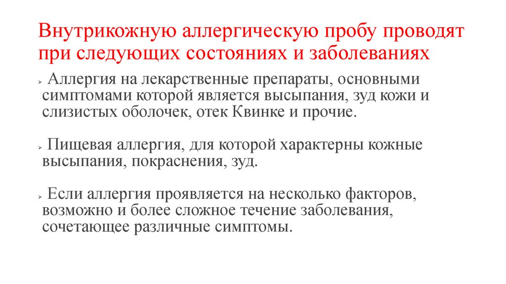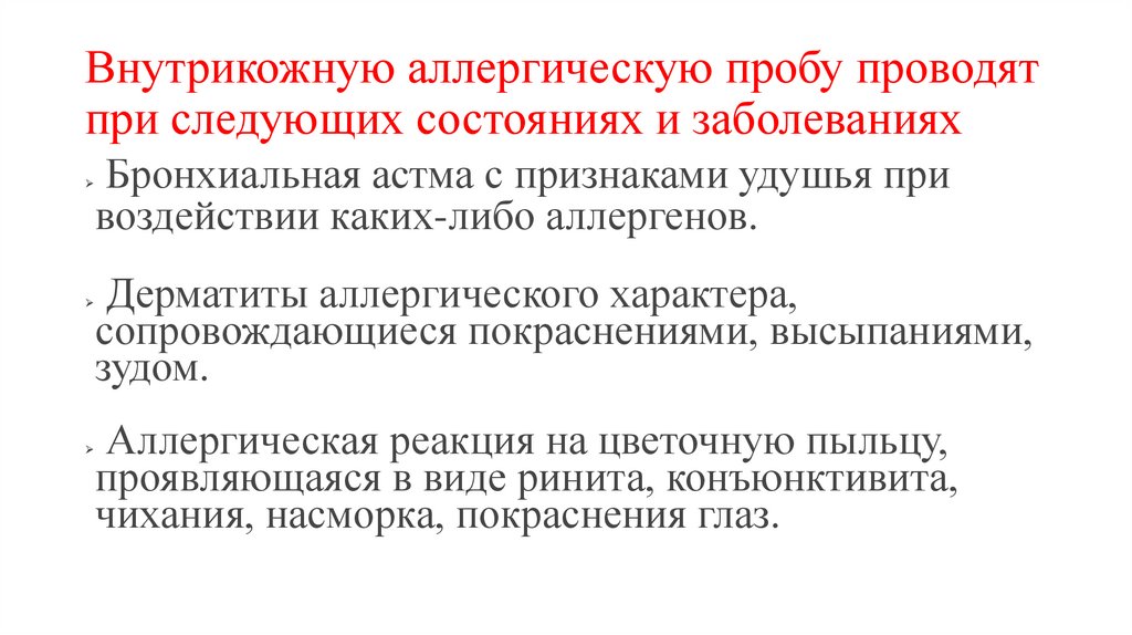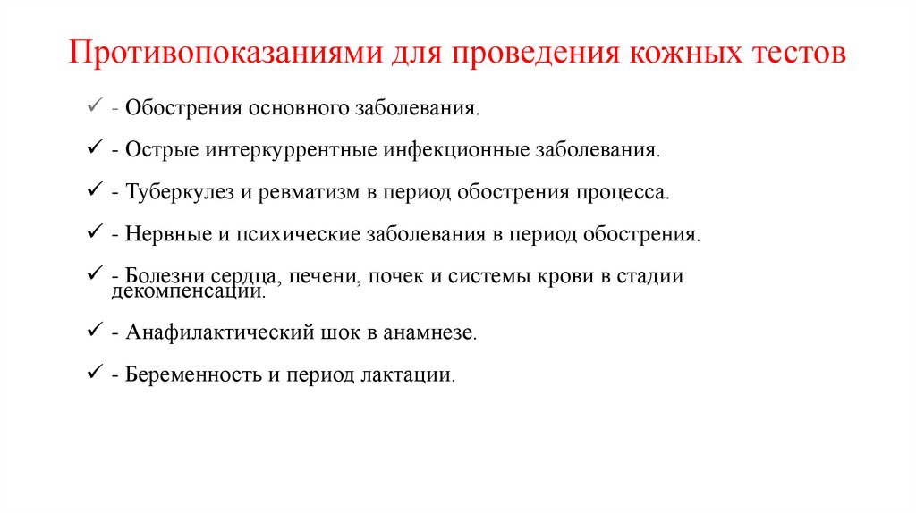 Противопоказаниями для проведения кожных тестов- Обострения основного заболевания.