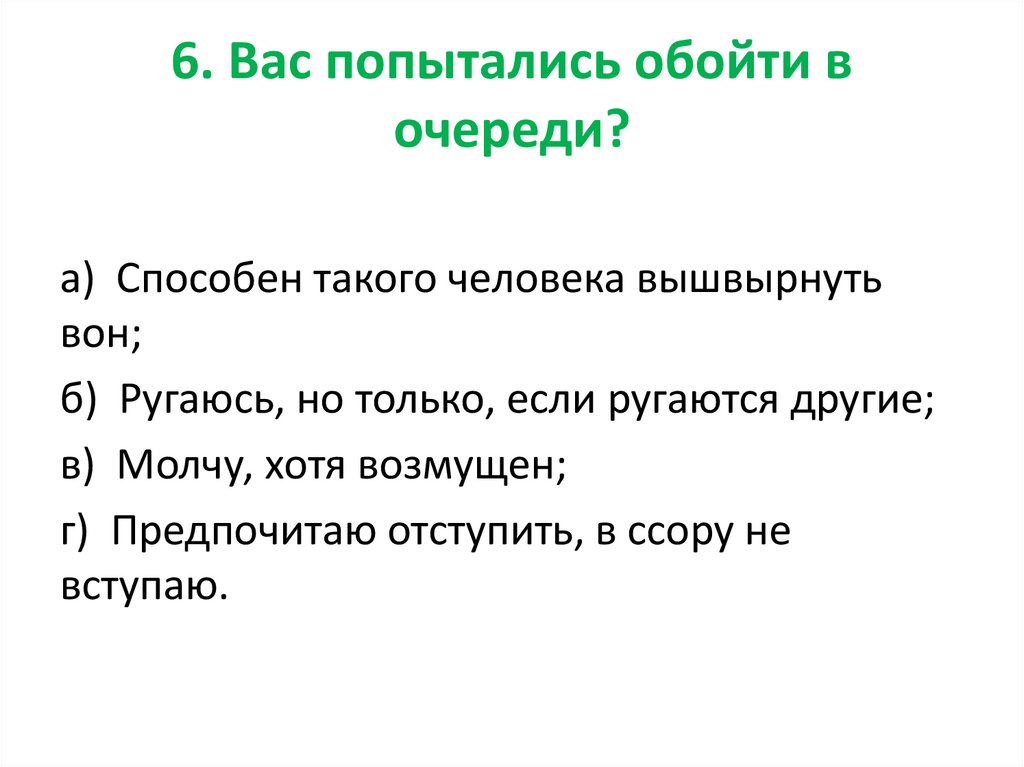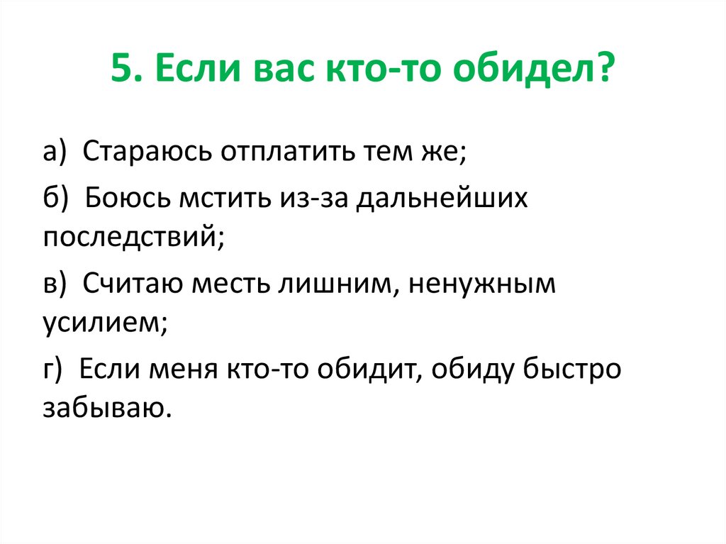 5. Если вас кто-то обидел?а) Стараюсь отплатить тем же;