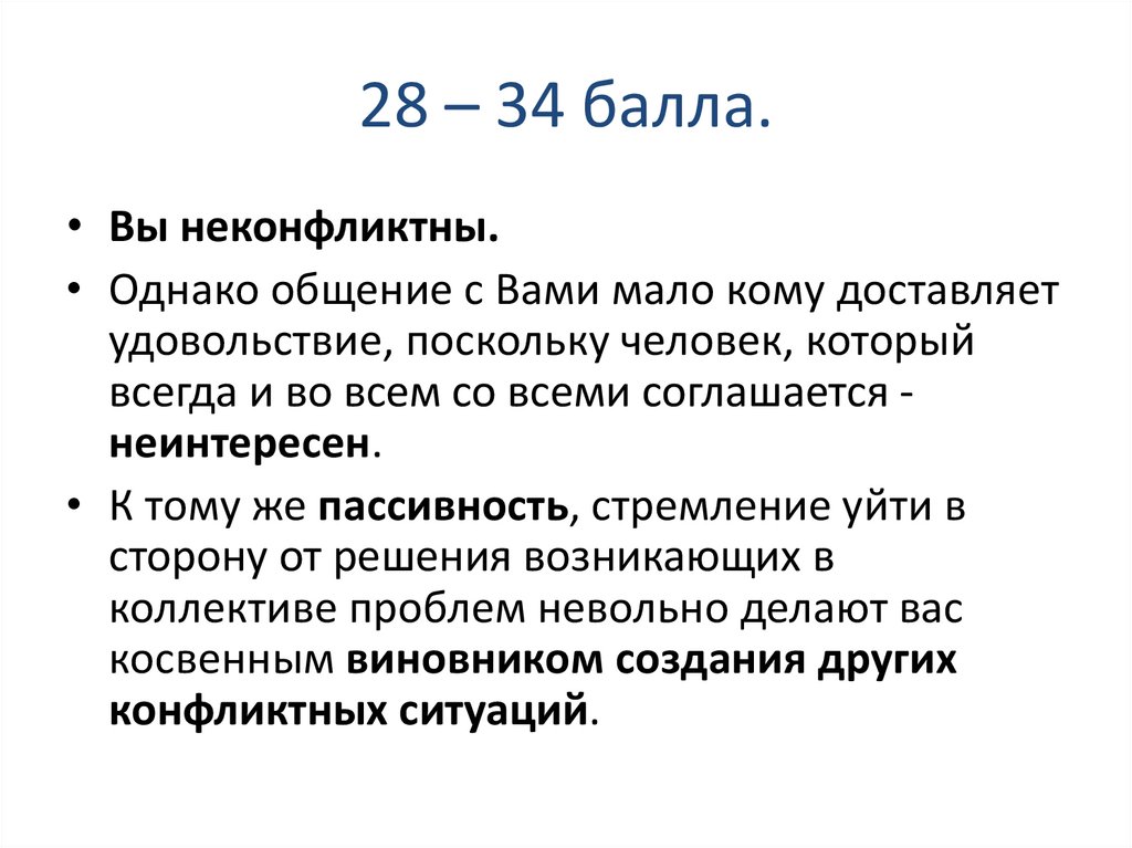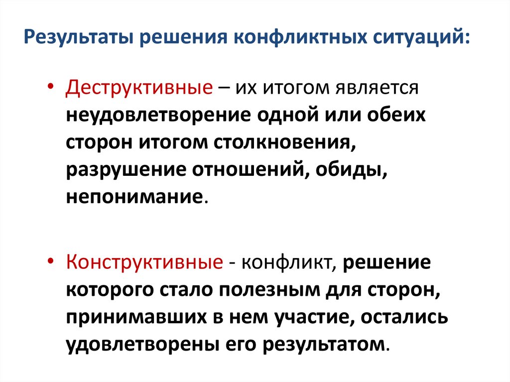 Результаты решения конфликтных ситуаций:• Деструктивные – их итогом является