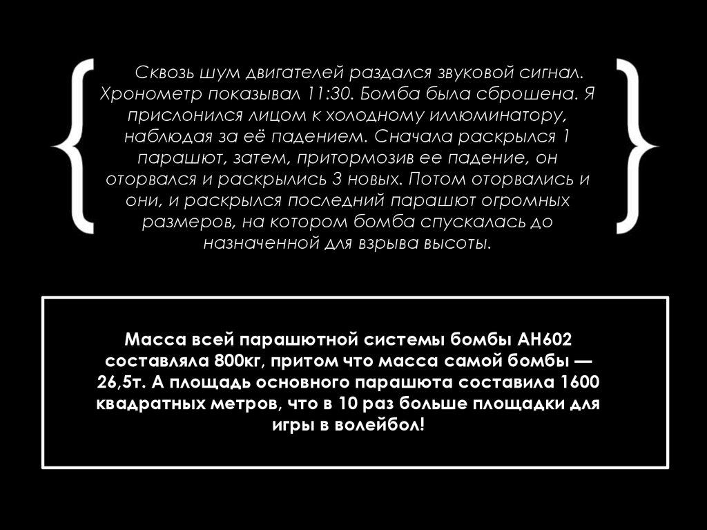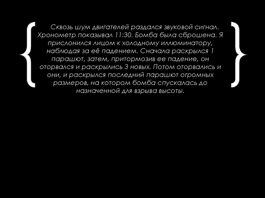 Сквозь шум двигателей раздался звуковой сигнал.Хронометр показывал 11:30. Бомба была сброшена. Я