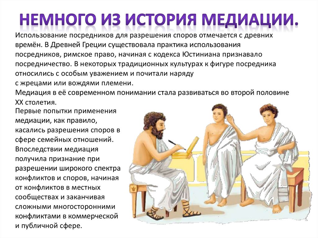 Использование посредников для разрешения споров отмечается с древнихвремён. В Древней Греции существовала практика использования