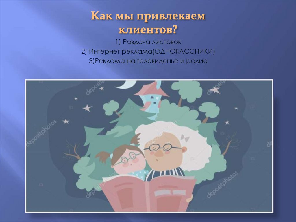 1) Раздача листовок2) Интернет реклама(ОДНОКЛССНИКИ)