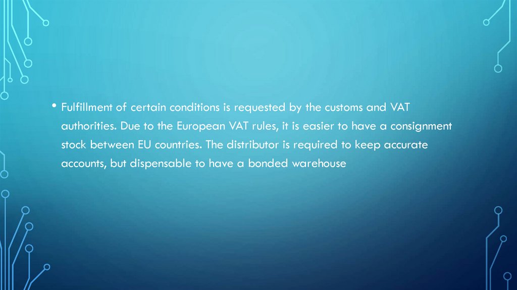 • Fulfillment of certain conditions is requested by the customs and VATauthorities. Due to the European VAT rules, it is easier to have a consignment