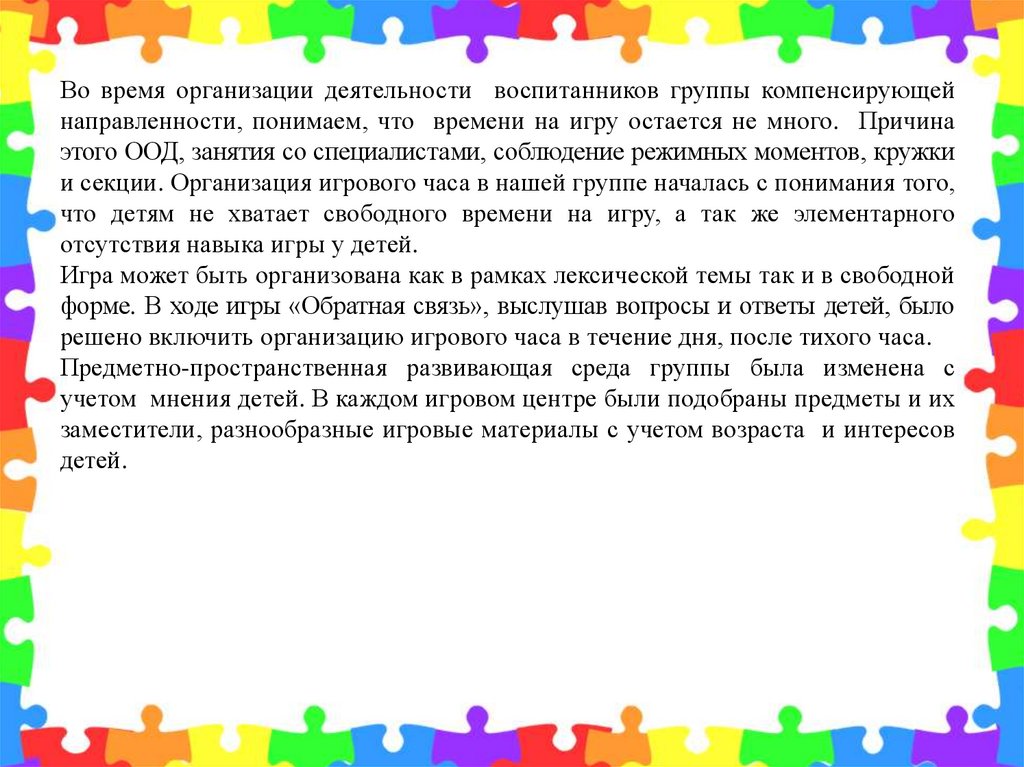 Во время организации деятельности воспитанников группы компенсирующейнаправленности, понимаем, что времени на игру остается не много. Причина