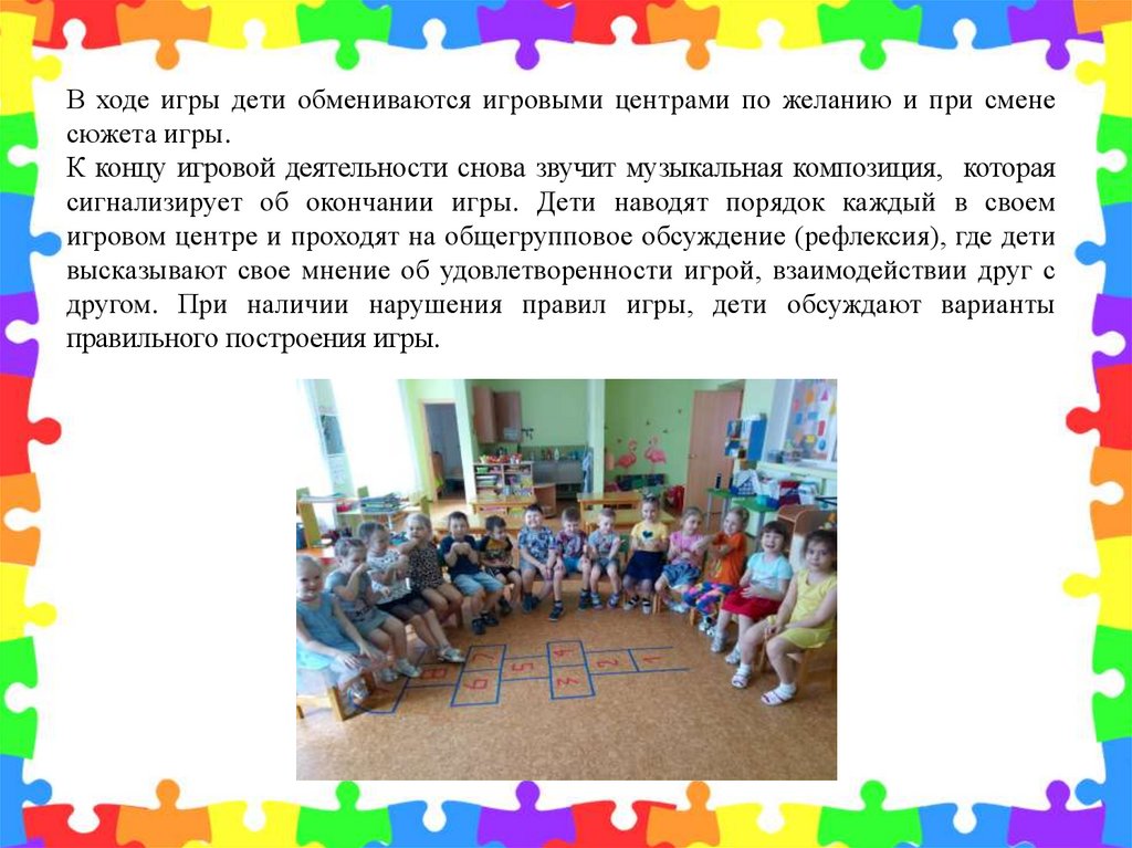 игровом центре и проходят на общегрупповое обсуждение (рефлексия), где дети
