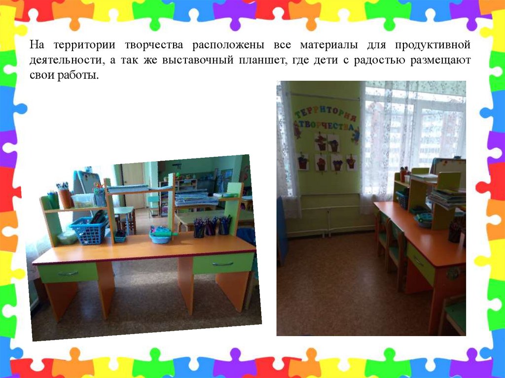 На территории творчества расположены все материалы для продуктивнойдеятельности, а так же выставочный планшет, где дети с радостью размещают