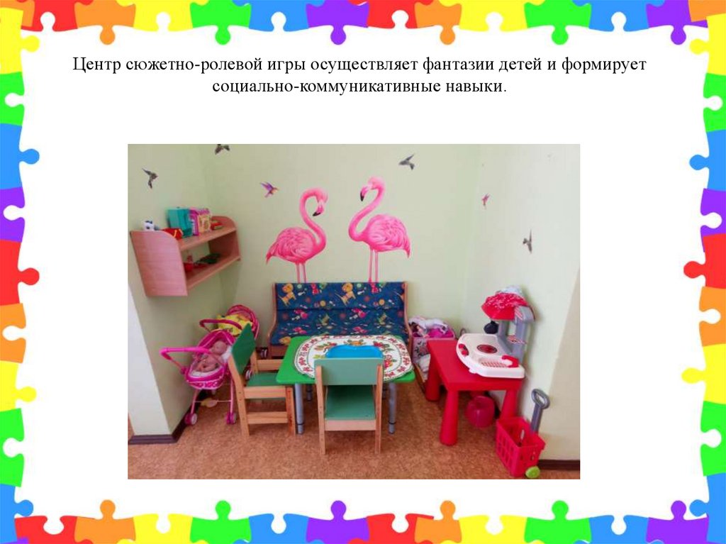 Центр сюжетно-ролевой игры осуществляет фантазии детей и формируетсоциально-коммуникативные навыки.