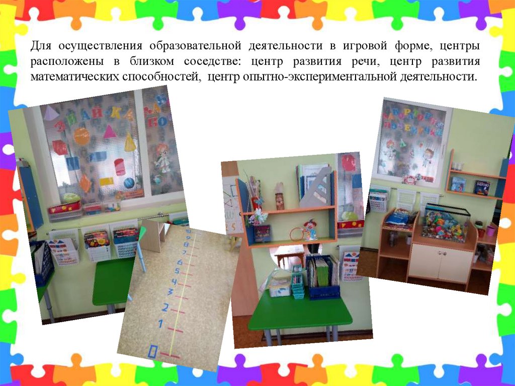 Для осуществления образовательной деятельности в игровой форме, центрырасположены в близком соседстве: центр развития речи, центр развития