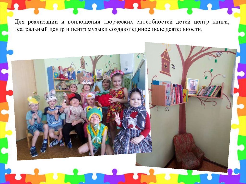 Для реализации и воплощения творческих способностей детей центр книги,театральный центр и центр музыки создают единое поле деятельности.