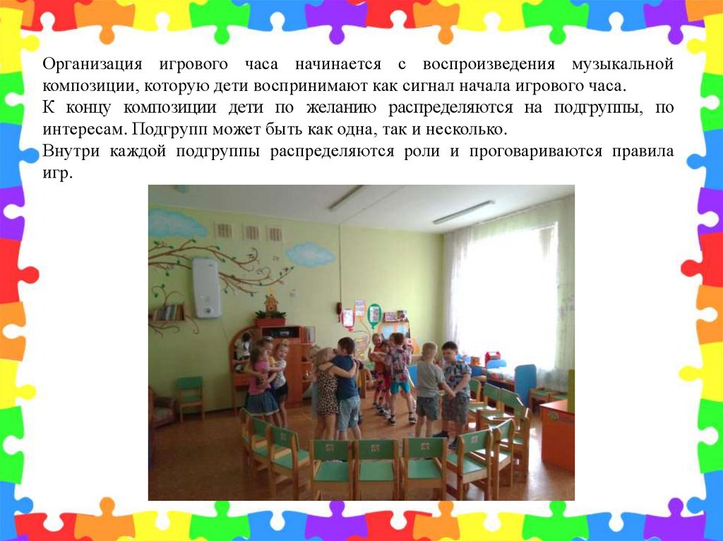 Организация игрового часа начинается с воспроизведения музыкальнойкомпозиции, которую дети воспринимают как сигнал начала игрового часа.