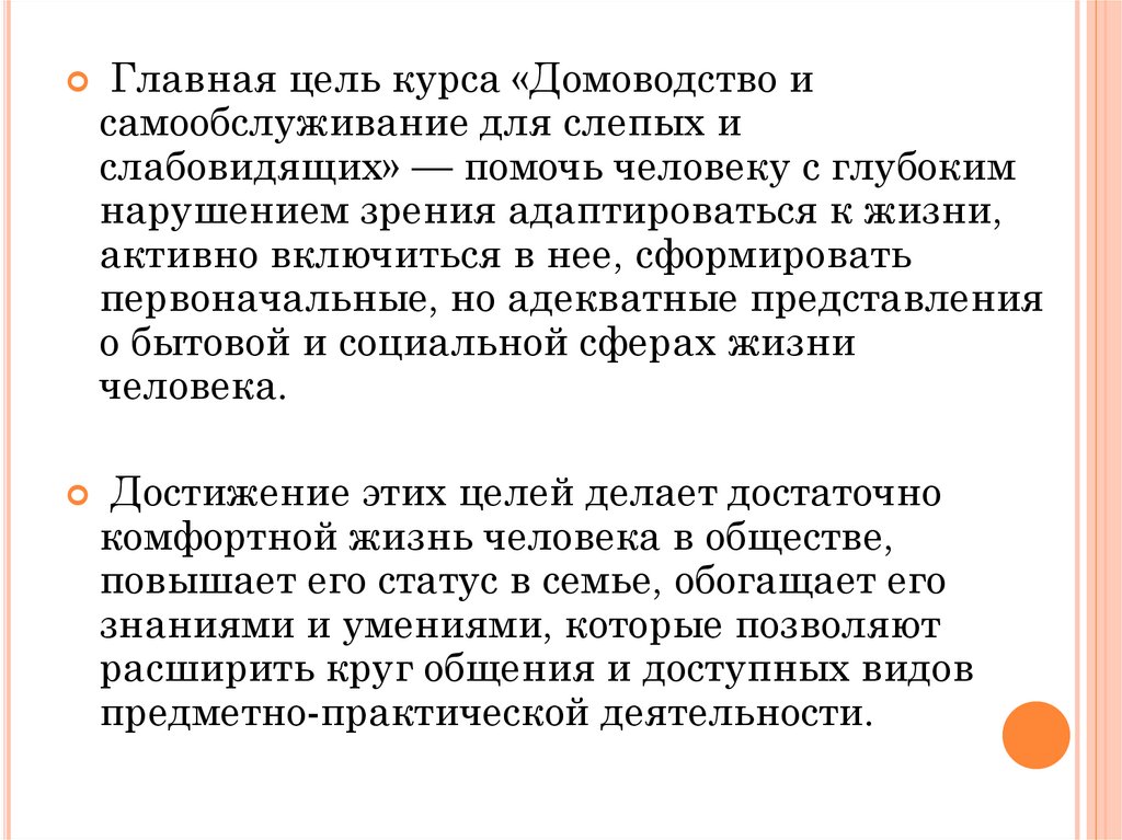 Главная цель курса «Домоводство исамообслуживание для слепых и