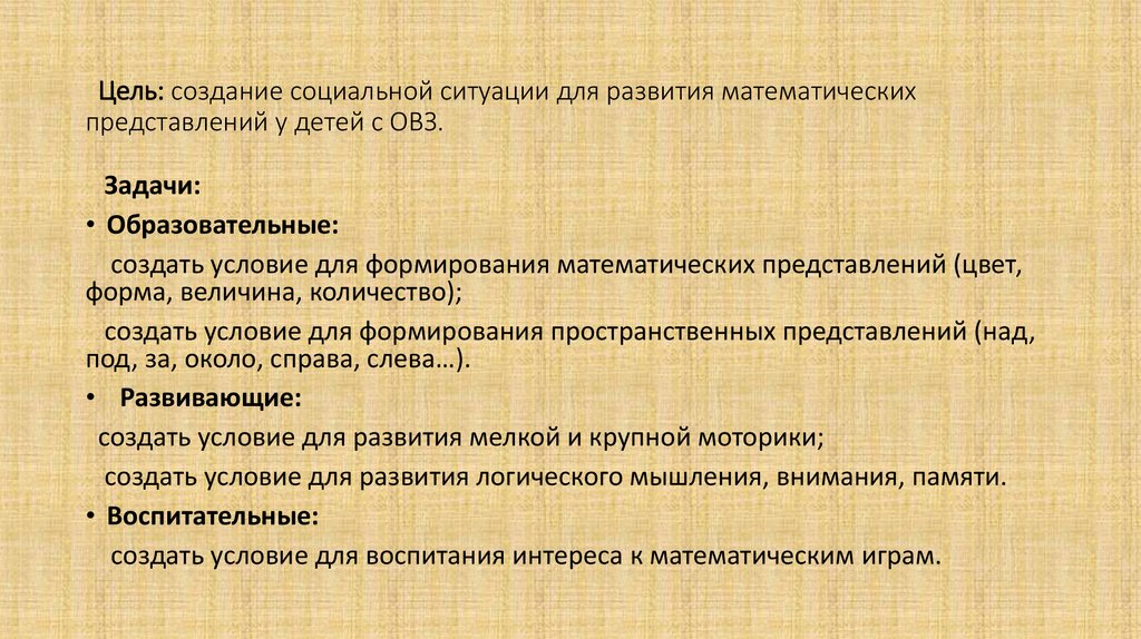 Цель: создание социальной ситуации для развития математическихпредставлений у детей с ОВЗ.