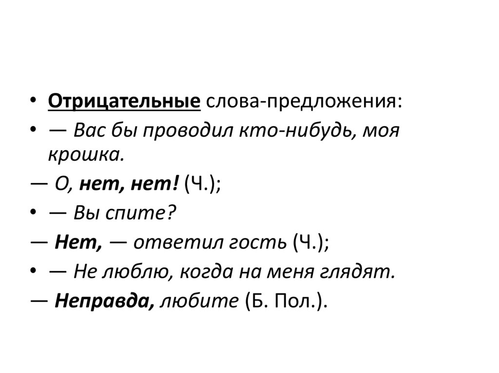 • Отрицательные слова-предложения:• — Вас бы проводил кто-нибудь, моя