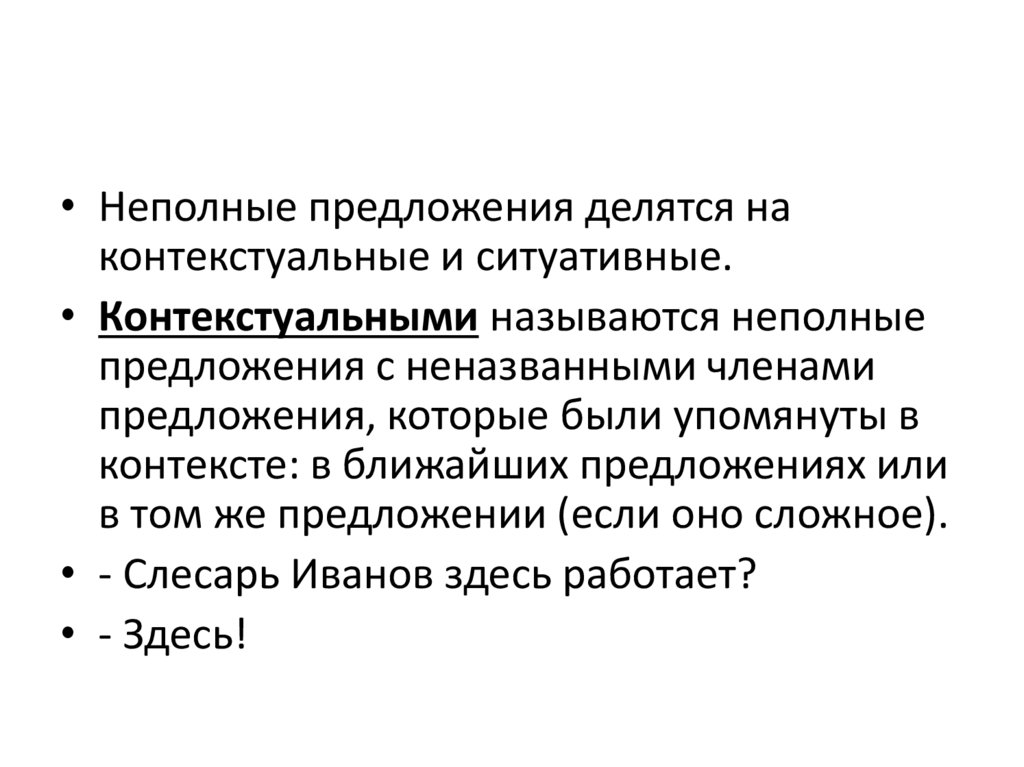 • Неполные предложения делятся наконтекстуальные и ситуативные.
