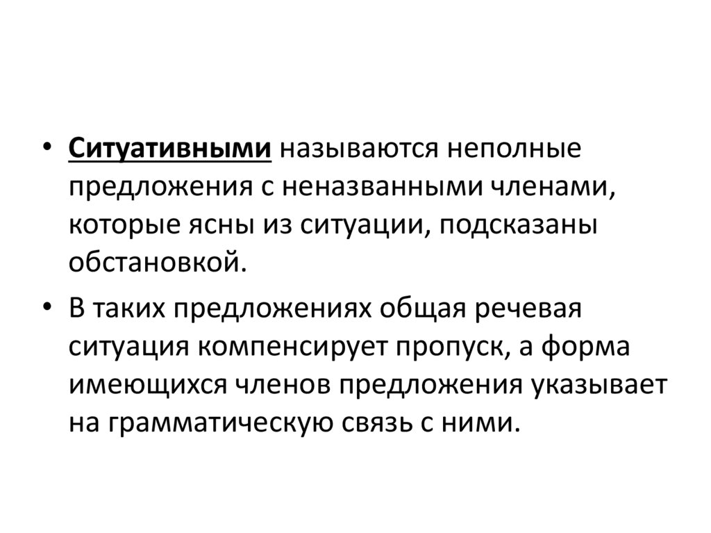 • Ситуативными называются неполныепредложения с неназванными членами,