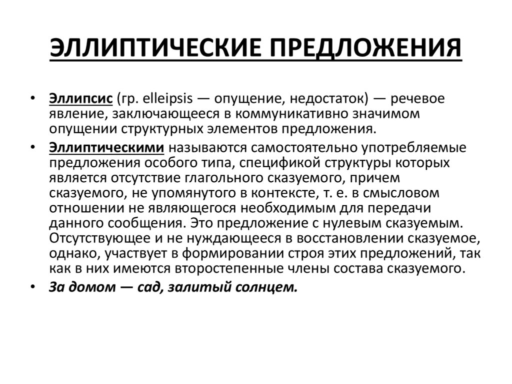 ЭЛЛИПТИЧЕСКИЕ ПРЕДЛОЖЕНИЯ• Эллипсис (гр. elleipsis — опущение, недостаток) — речевое