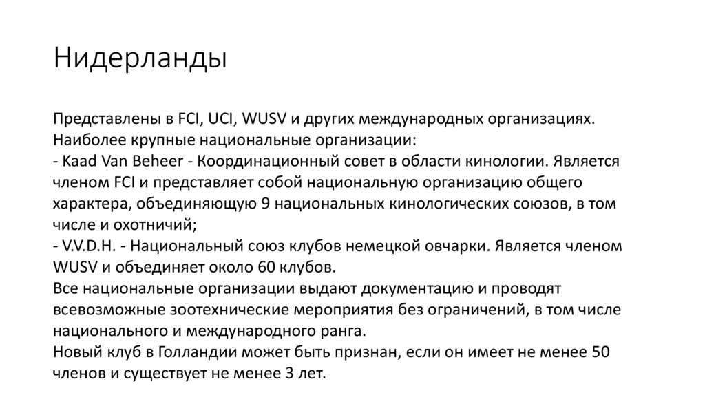 НидерландыПредставлены в FCI, UCI, WUSV и других международных организациях.