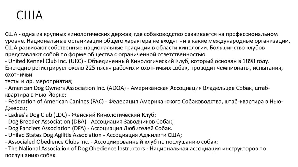 СШАСША - одна из крупных кинологических держав, где собаководство развивается на профессиональном