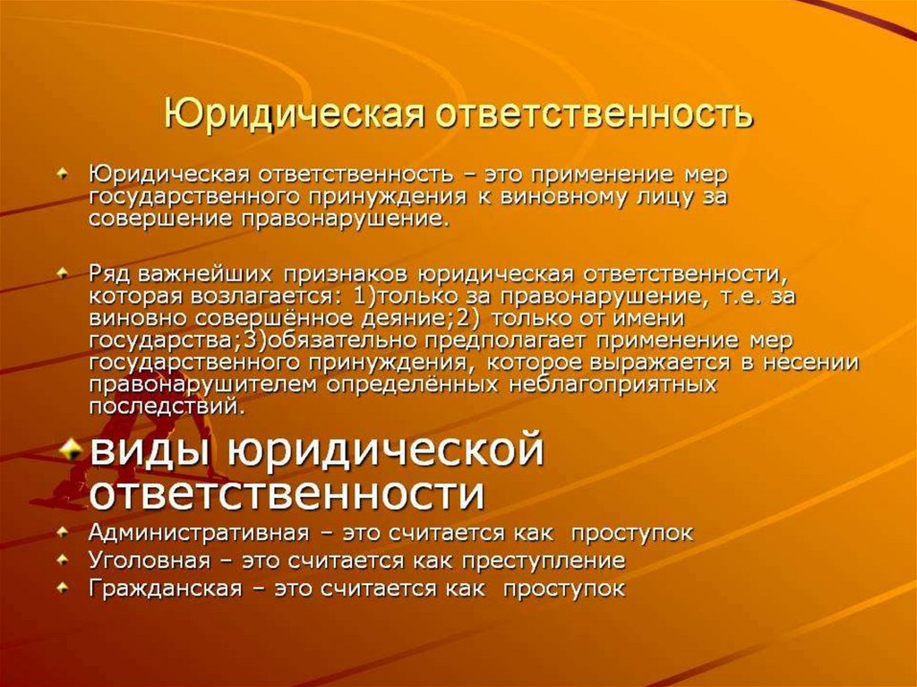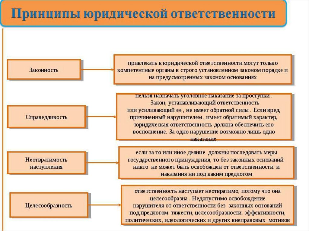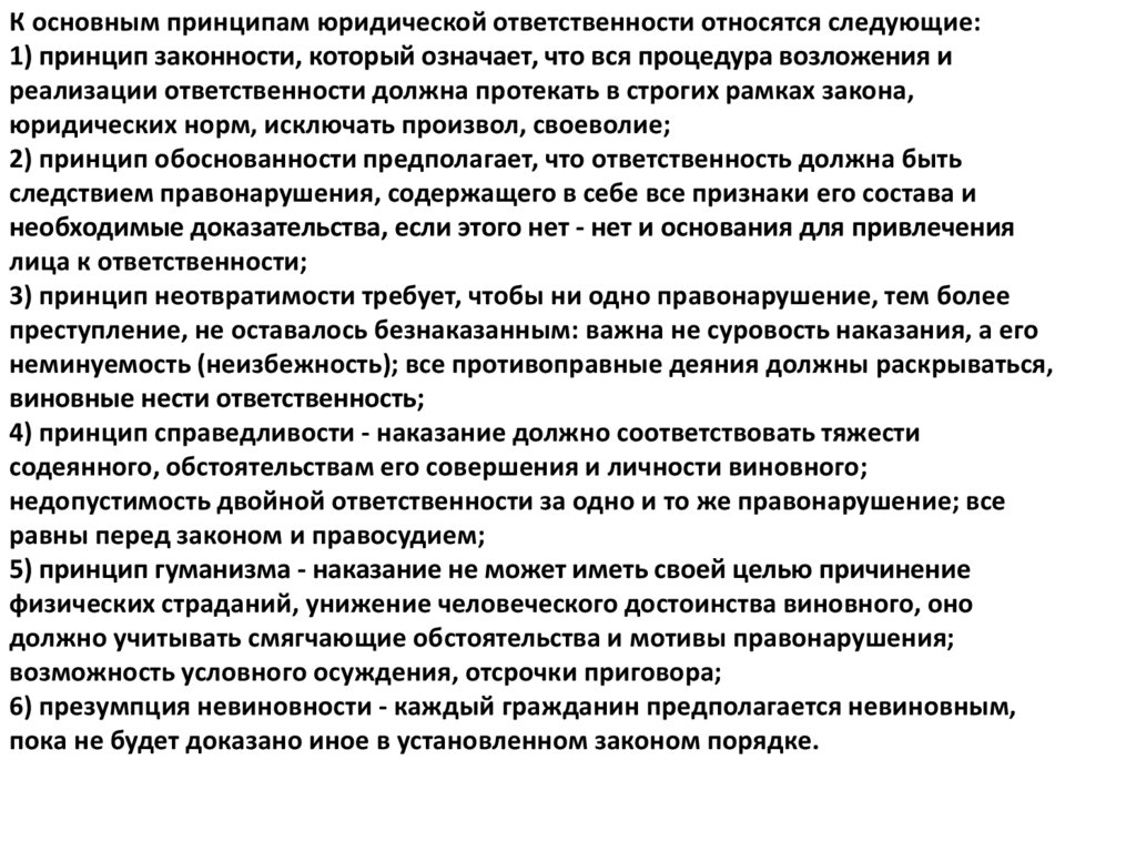 К основным принципам юридической ответственности относятся следующие:1) принцип законности, который означает, что вся процедура возложения и