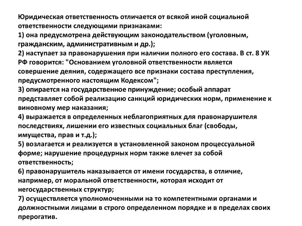 Юридическая ответственность отличается от всякой иной социальнойответственности следующими признаками: