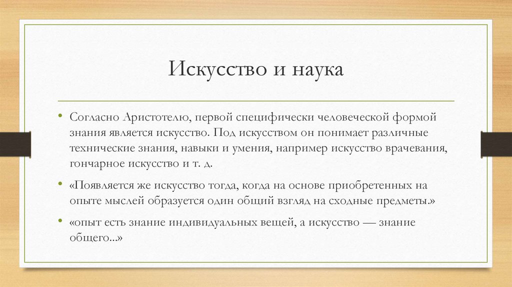 Искусство и наука• Согласно Аристотелю, первой специфически человеческой формой