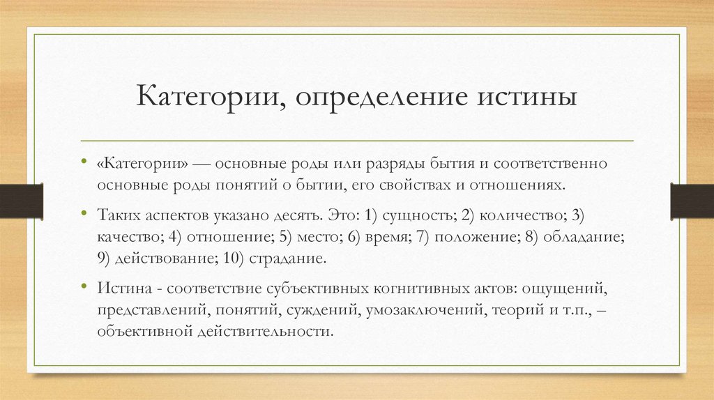Категории, определение истины• «Категории» — основные роды или разряды бытия и соответственно