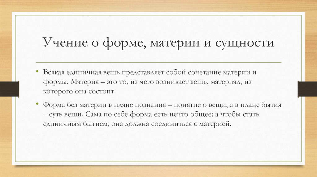 Учение о форме, материи и сущности• Всякая единичная вещь представляет собой сочетание материи и
