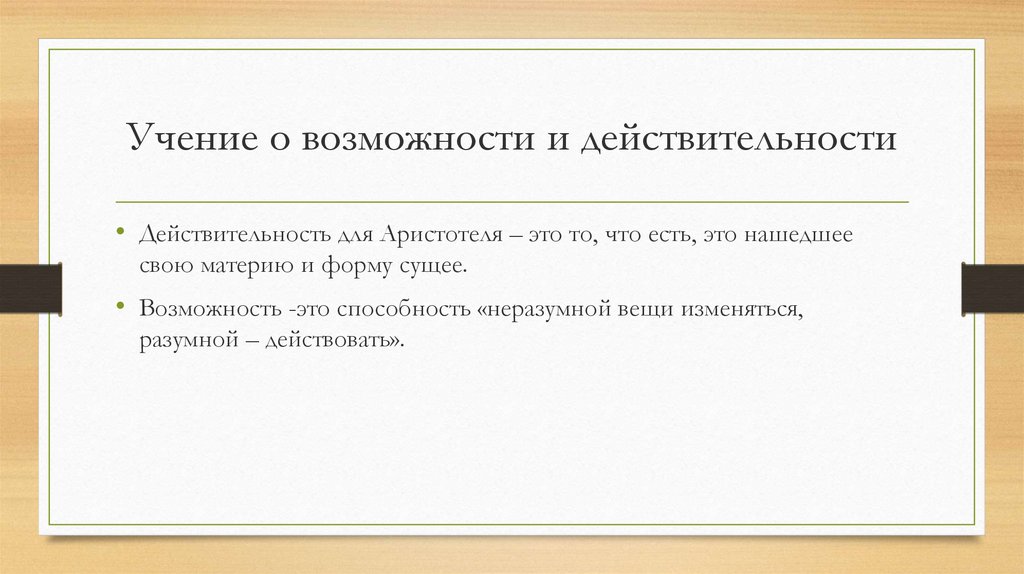 Учение о возможности и действительности• Действительность для Аристотеля – это то, что есть, это нашедшее