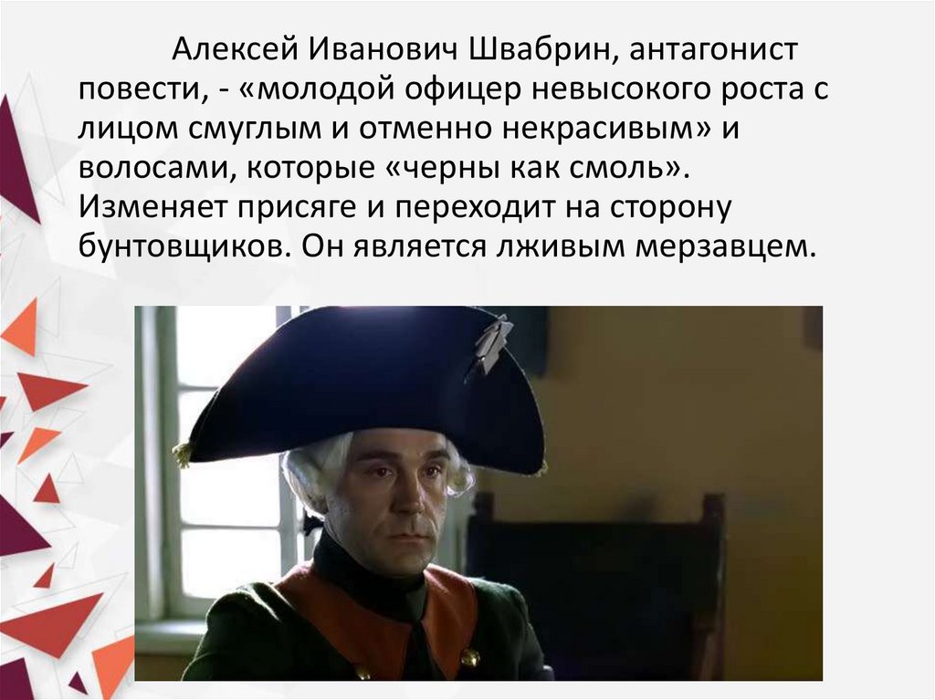 Алексей Иванович Швабрин, антагонистповести, - «молодой офицер невысокого роста с