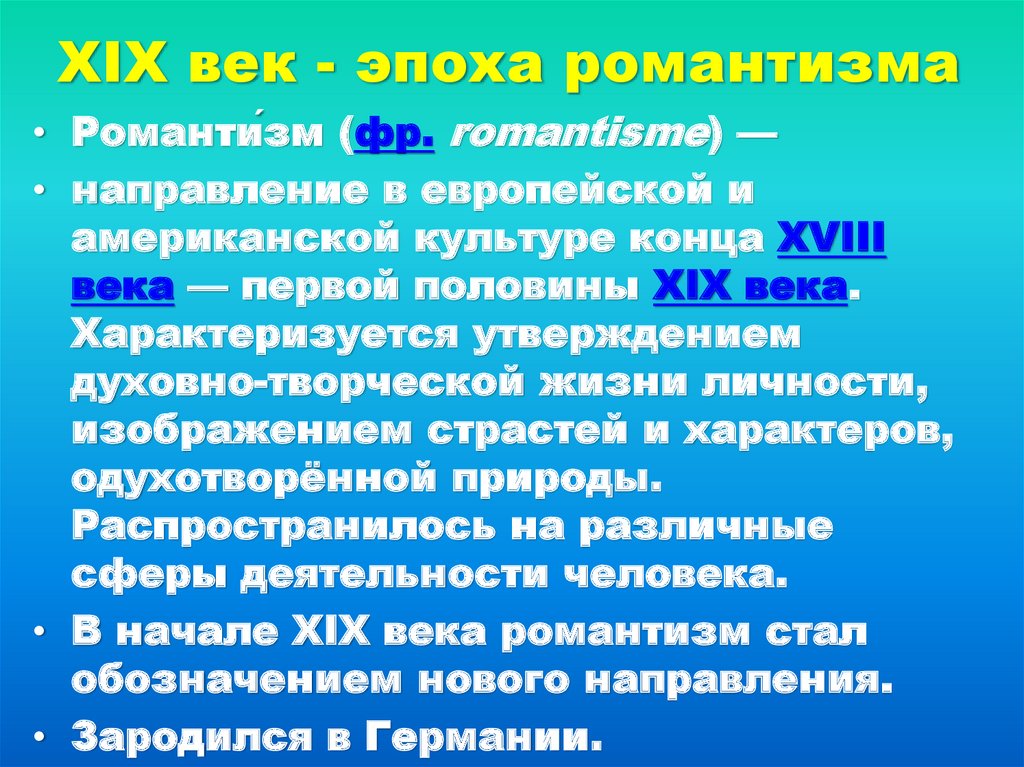 XIX век - эпоха романтизма• Романти́зм (фр. romantisme) —