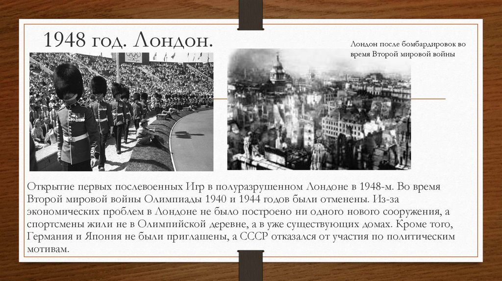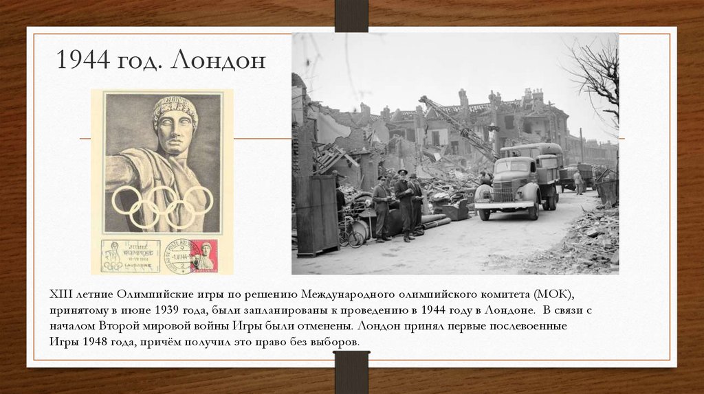 1944 год. ЛондонXIII летние Олимпийские игры по решению Международного олимпийского комитета (МОК),