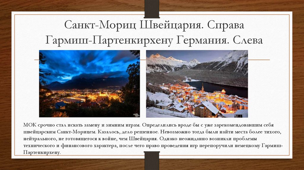 Санкт-Мориц Швейцария. СправаГармиш-Партенкирхену Германия. Слева