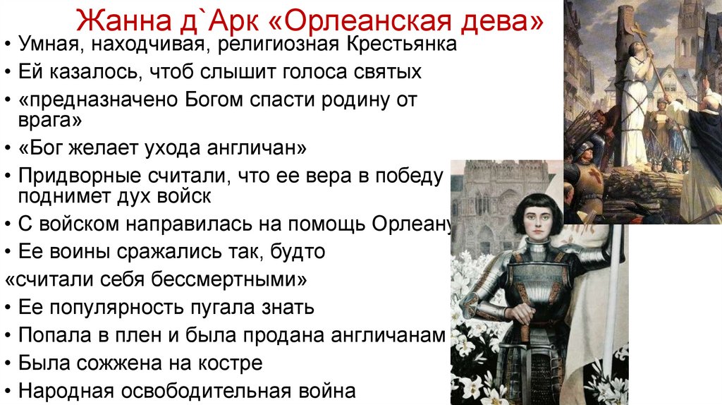 Жанна д`Арк «Орлеанская дева»• Умная, находчивая, религиозная Крестьянка