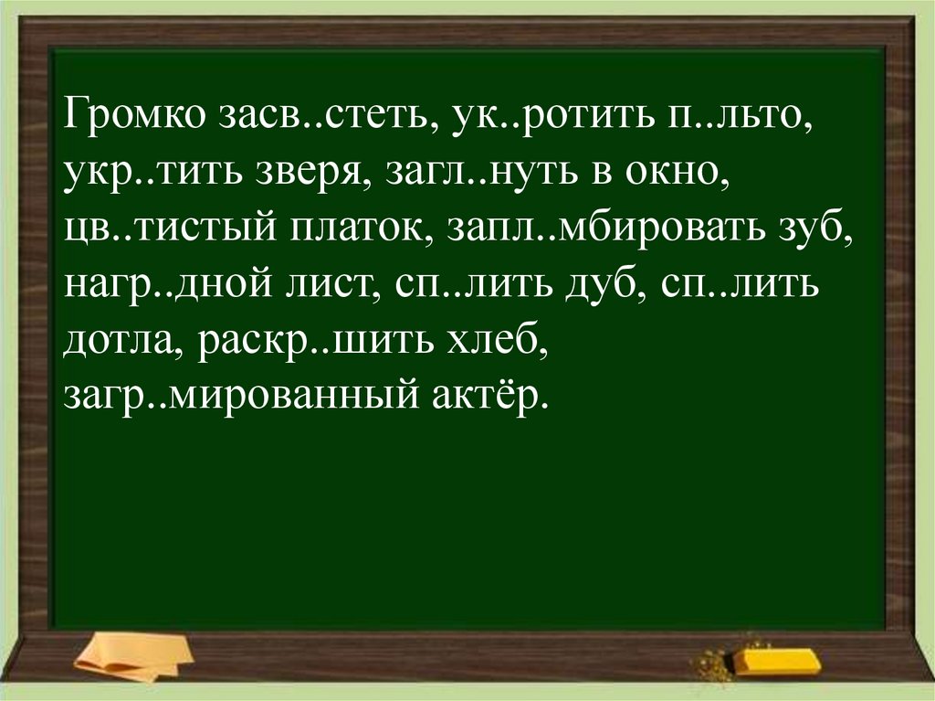 Громко засв..стеть, ук..ротить п..льто,укр..тить зверя, загл..нуть в окно,