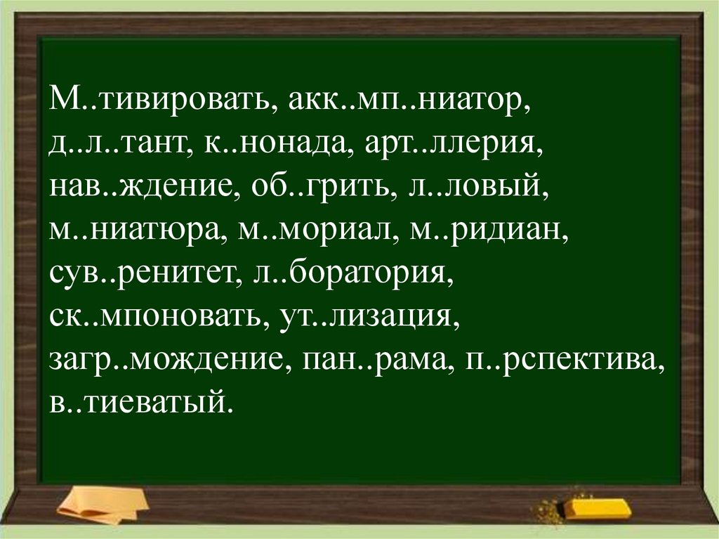 М..тивировать, акк..мп..ниатор,д..л..тант, к..нонада, арт..ллерия,