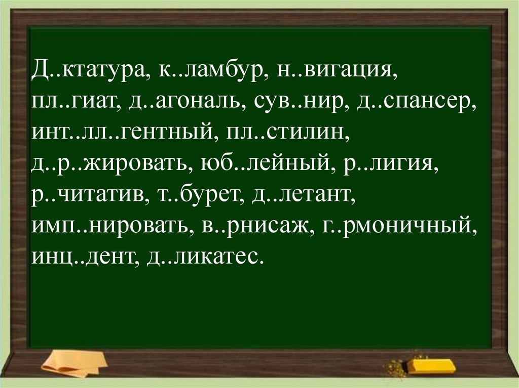 Д..ктатура, к..ламбур, н..вигация,пл..гиат, д..агональ, сув..нир, д..спансер,