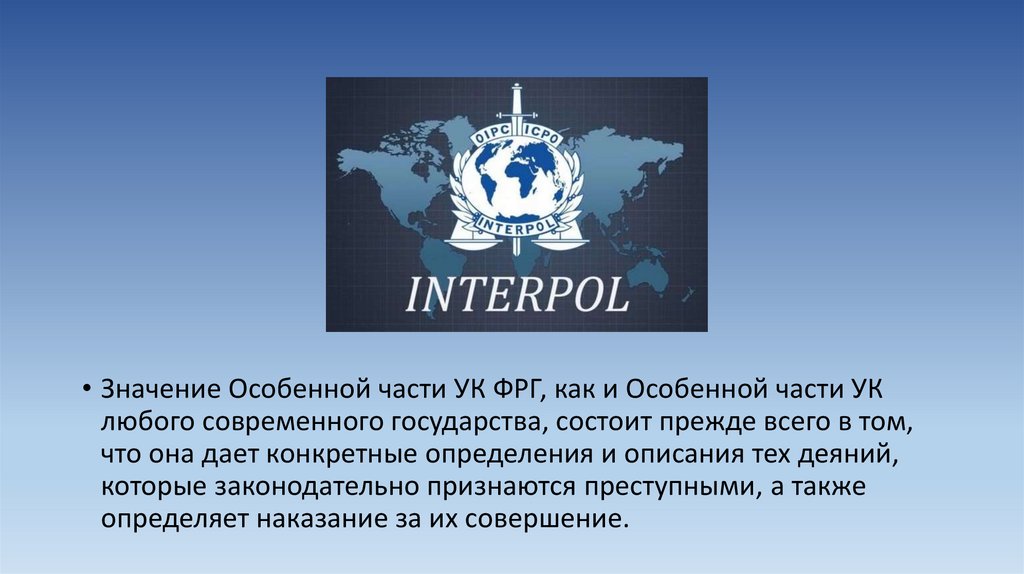 • Значение Особенной части УК ФРГ, как и Особенной части УКлюбого современного государства, состоит прежде всего в том,
