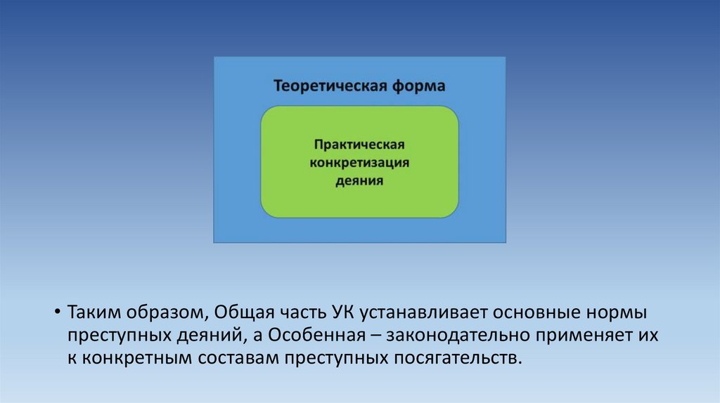 • Таким образом, Общая часть УК устанавливает основные нормыпреступных деяний, а Особенная – законодательно применяет их