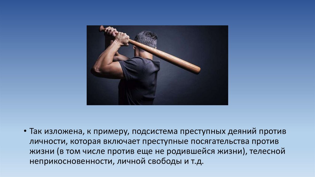 • Так изложена, к примеру, подсистема преступных деяний противличности, которая включает преступные посягательства против