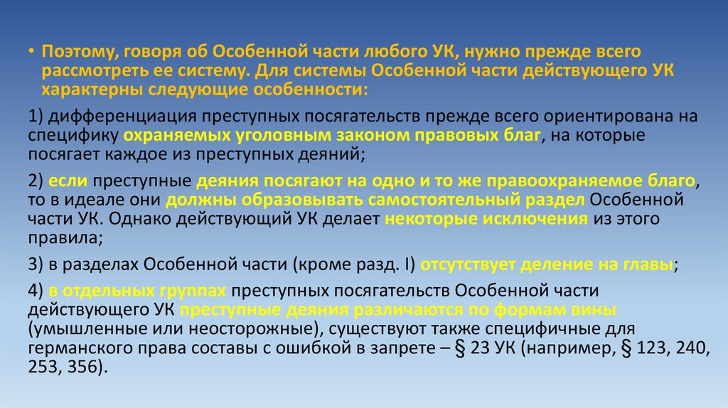 • Поэтому, говоря об Особенной части любого УК, нужно прежде всегорассмотреть ее систему. Для системы Особенной части действующего УК