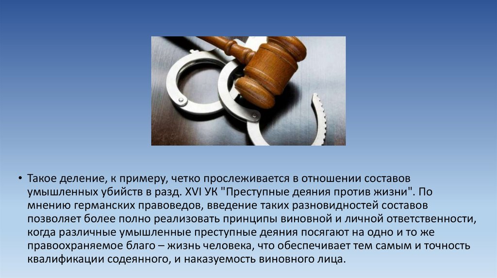 • Такое деление, к примеру, четко прослеживается в отношении составовумышленных убийств в разд. XVI УК "Преступные деяния против жизни". По