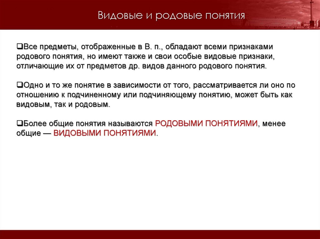 родового понятия, но имеют также и свои особые видовые признаки,