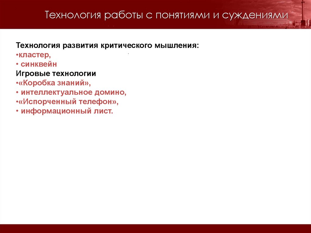 Технология работы с понятиями и суждениямиТехнология развития критического мышления: