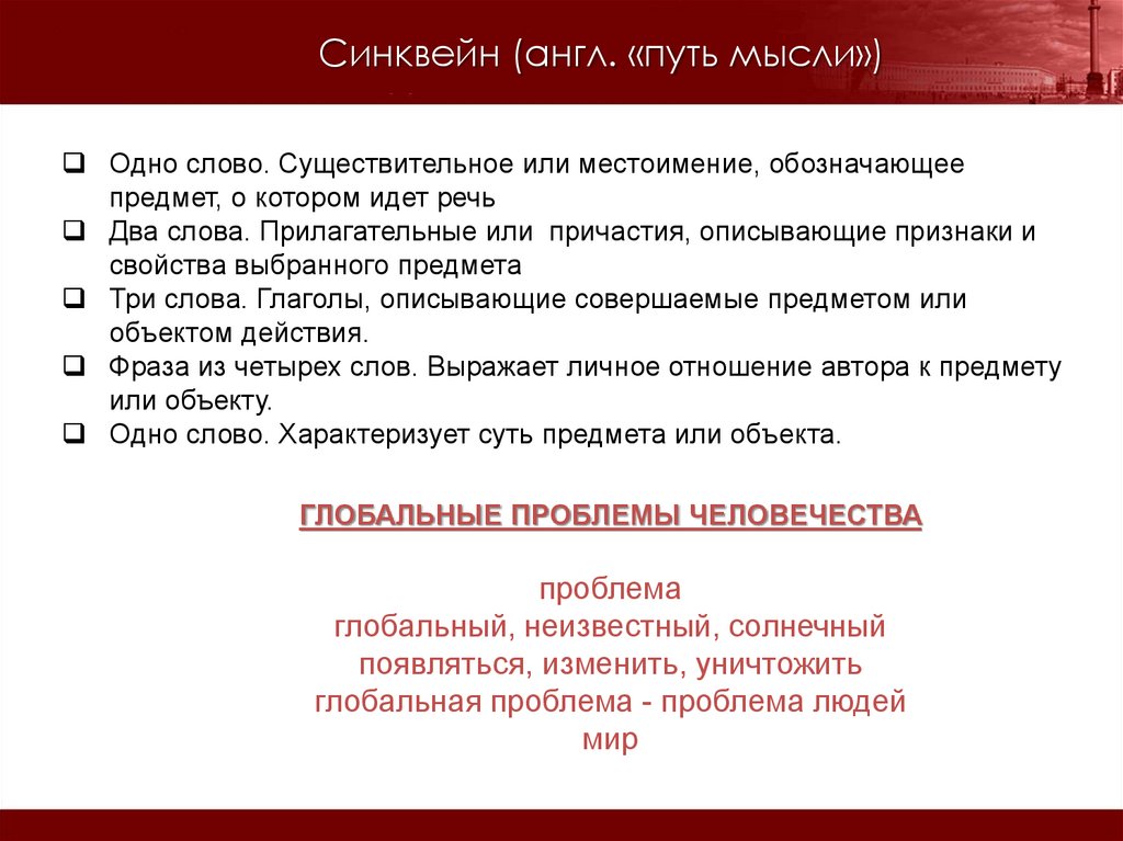 Синквейн (англ. «путь мысли»)Одно слово. Существительное или местоимение, обозначающее