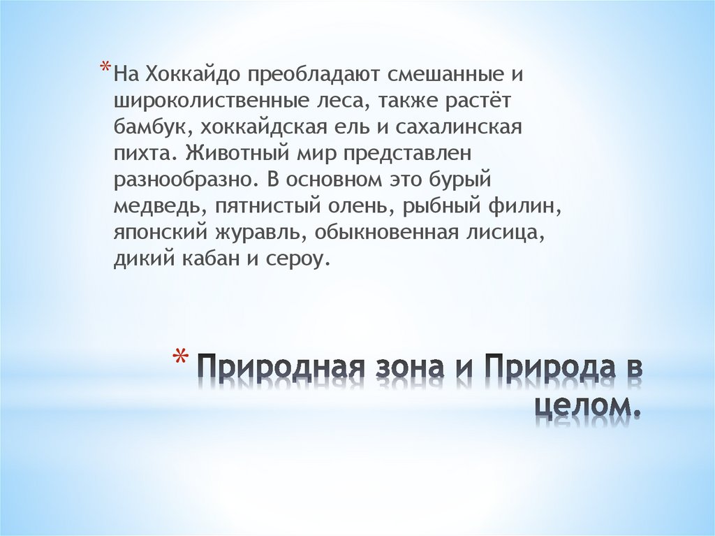 * На Хоккайдо преобладают смешанные ишироколиственные леса, также растёт