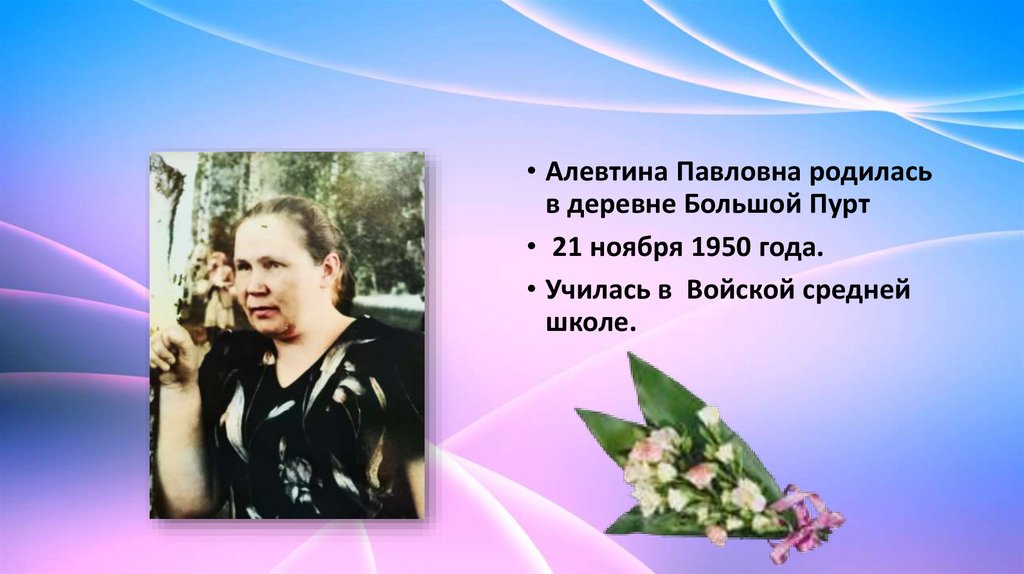 • Алевтина Павловна родиласьв деревне Большой Пурт