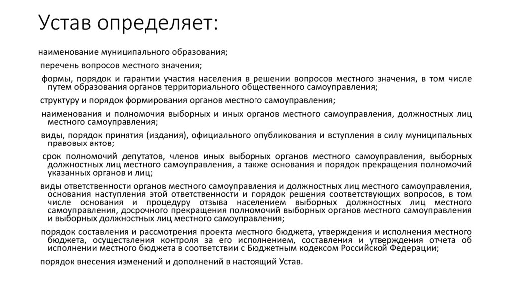 Устав определяет:наименование муниципального образования;
