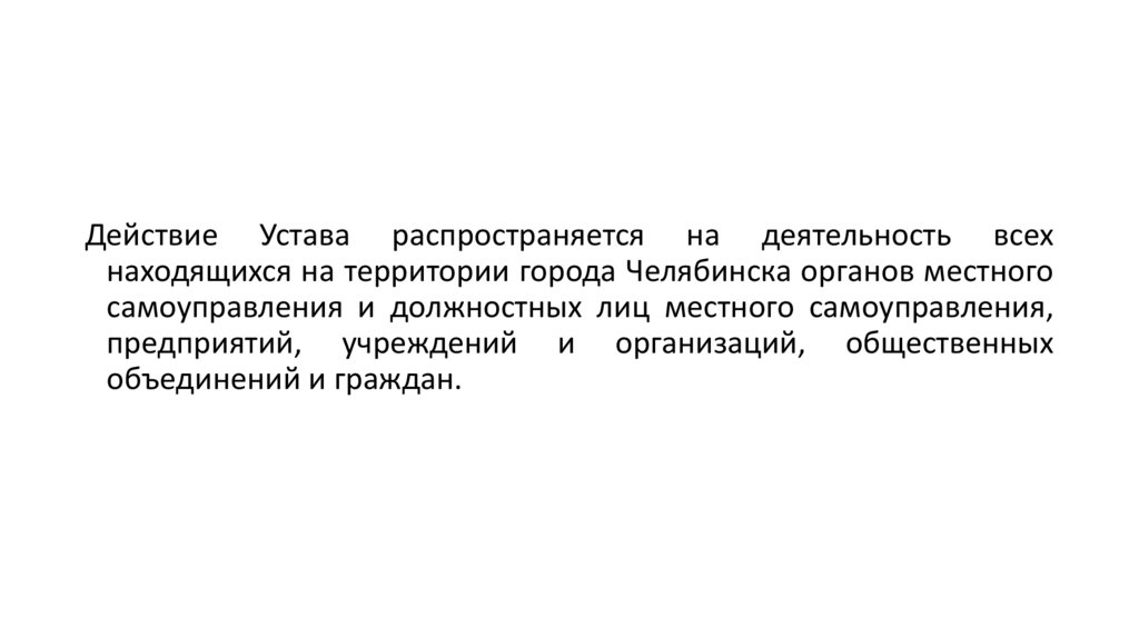 Действие Устава распространяется на деятельность всехнаходящихся на территории города Челябинска органов местного