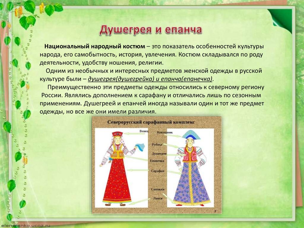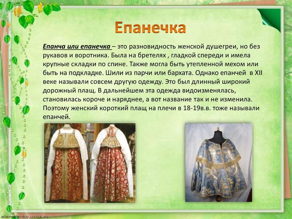 Епанча или епанечка – это разновидность женской душегреи, но безрукавов и воротника. Была на бретелях , гладкой спереди и имела