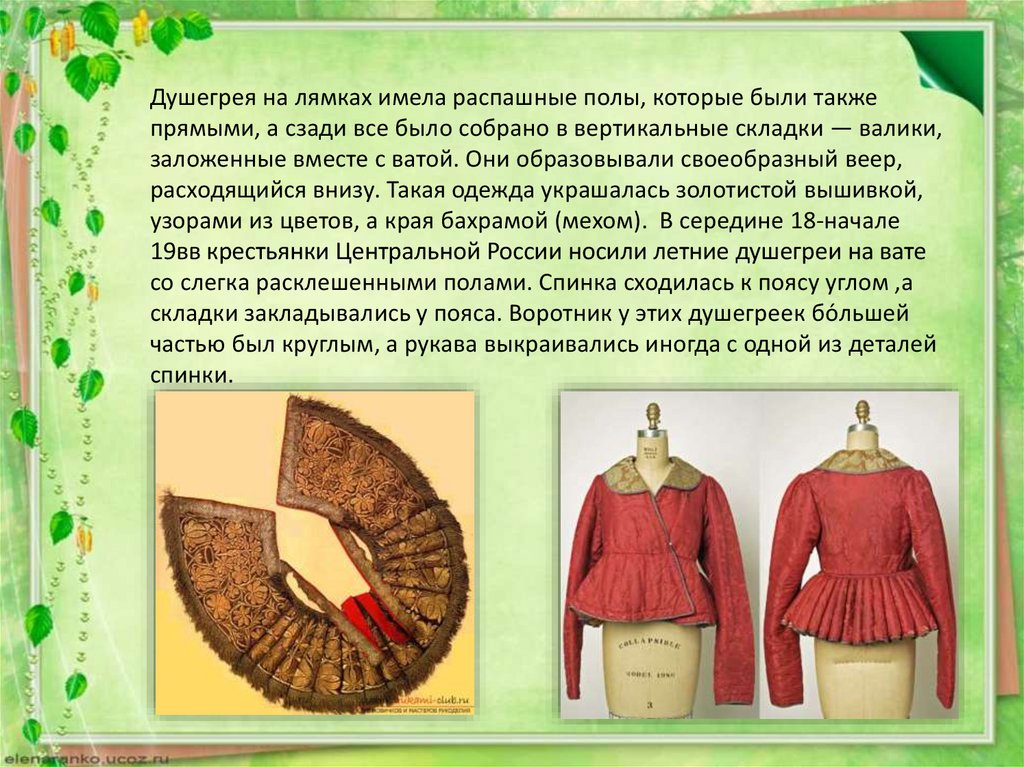Душегрея на лямках имела распашные полы, которые были такжепрямыми, а сзади все было собрано в вертикальные складки — валики,
